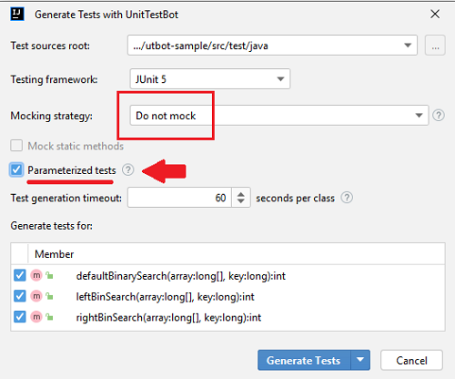 In the Generate Tests with UnitTestBot window choose your Mocking strategy: