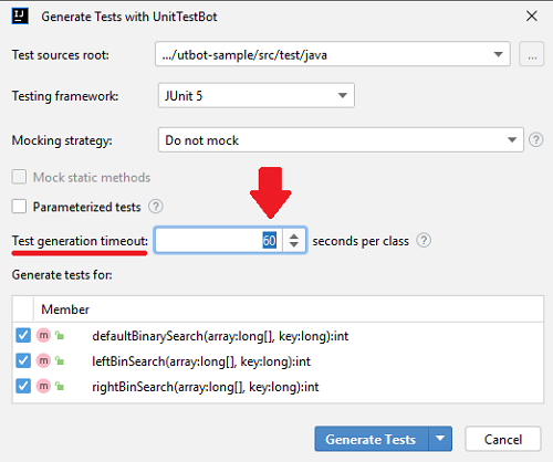 In the Generate Tests with UnitTestBot window you can set the timeout for both the fuzzing process and the symbolic engine to generate tests for a given class.